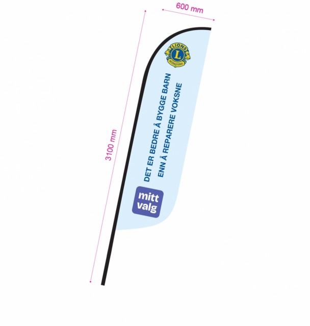 Beachflagg lyseblått med Lions logo, tekst og Mitt Valg logo.