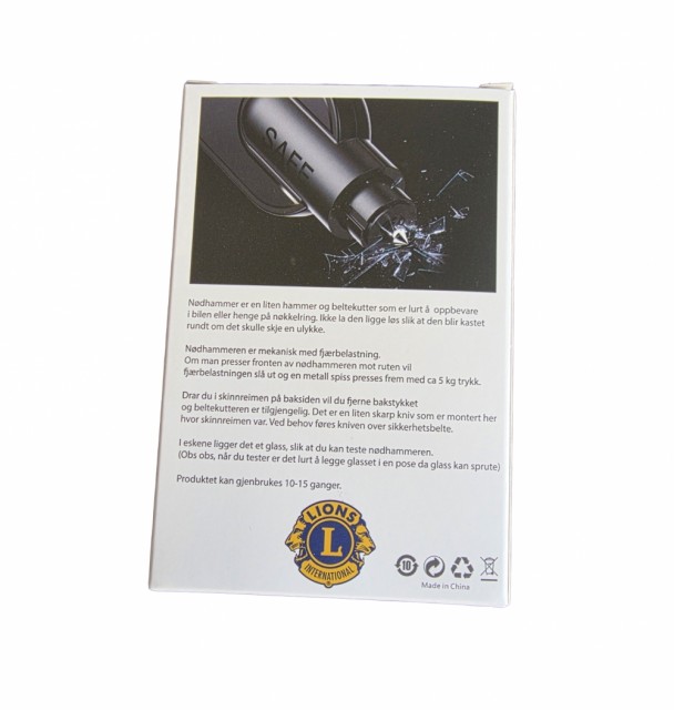 Lions Nødhammer PrisNOK65,00 inkl. mva. På lager: 100 stk. Antall Kjøp Ønskeliste Lagerstatus: På lager: 100 stk. Artikkelnr.: LIO9956 Del dette Produktinfo Produktanmeldelser (0) Nødhammer preget med Lions logo. Nødhammer er en liten hammer og beltekutter som oppbevares i bilen eller i en nøkkelring. Nødhammeren kan benyttes i nødstilfelle for å knuse bilruten og kutte bilbelte. Skriv en produktanmeldelse og del dine erfaringer med dette produktet med andre kunder. Email Navn Din vurdering? 1 star 2 star 3 star 4 star 5 star 6 star Oppgi en tittel for anmeldelsen din Skriv inn produktanmeldelsen i feltet under